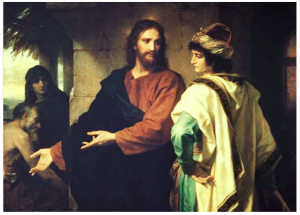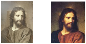Below we have the head of Christ depicted in our picture next to an extracted detail from ‘Christ and the Rich Young Ruler’. Details from the main picture correlate to the detail on the portrait picture including the stone wall behind and the edges of the blocks to the right of Christ’s head. Unfortunately, the glass over the print on our picture causes some reflection on the photographed image.