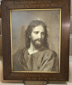 Frances also requested that the following words appear on the top of the frame ‘Only the Golden Rule of Christ can bring the Golden Age of Man’ and underneath ‘Neither do I condemn thee – go and sin no more’. These are the words etched into the frame of the picture that we have in our collection and which was bestowed between these two women.